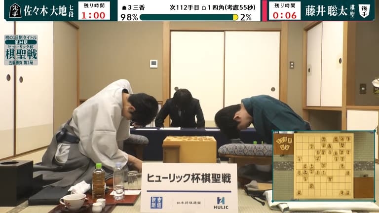 棋聖戦 対局開始と終局 終局の瞬間 第94期 ヒューリック杯棋聖戦 五番勝負 第二局 藤井聡太棋聖 対 佐々木大地七段 将棋 無料動画 見逃し配信を見るなら Abema
